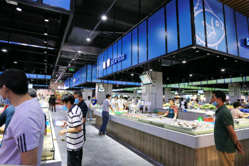 長(zhǎng)樂(lè)農(nóng)貿(mào)市場(chǎng),位于杭州市拱墅區(qū)商務(wù)辦公和居民生活的核心商圈,市場(chǎng)采用創(chuàng)新型“1+N”模式,即以社區(qū)智能生態(tài)化農(nóng)貿(mào)市場(chǎng)為核心,布局便民購(gòu)物商超、社區(qū)健康膳堂、宅配到家等服務(wù)業(yè)態(tài),打造真正的“一刻鐘便民生活圈”。
